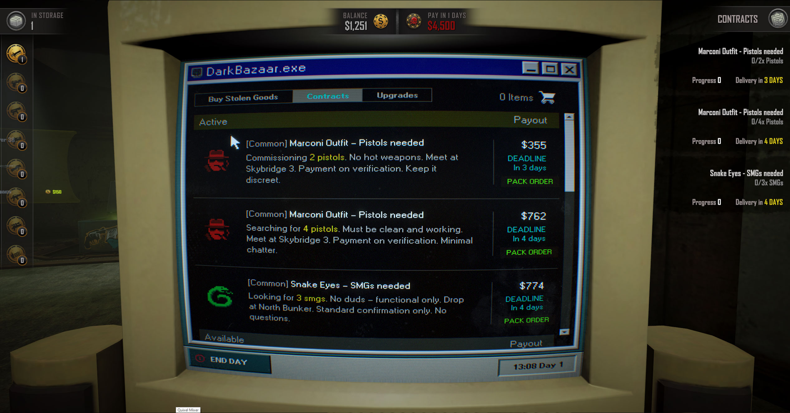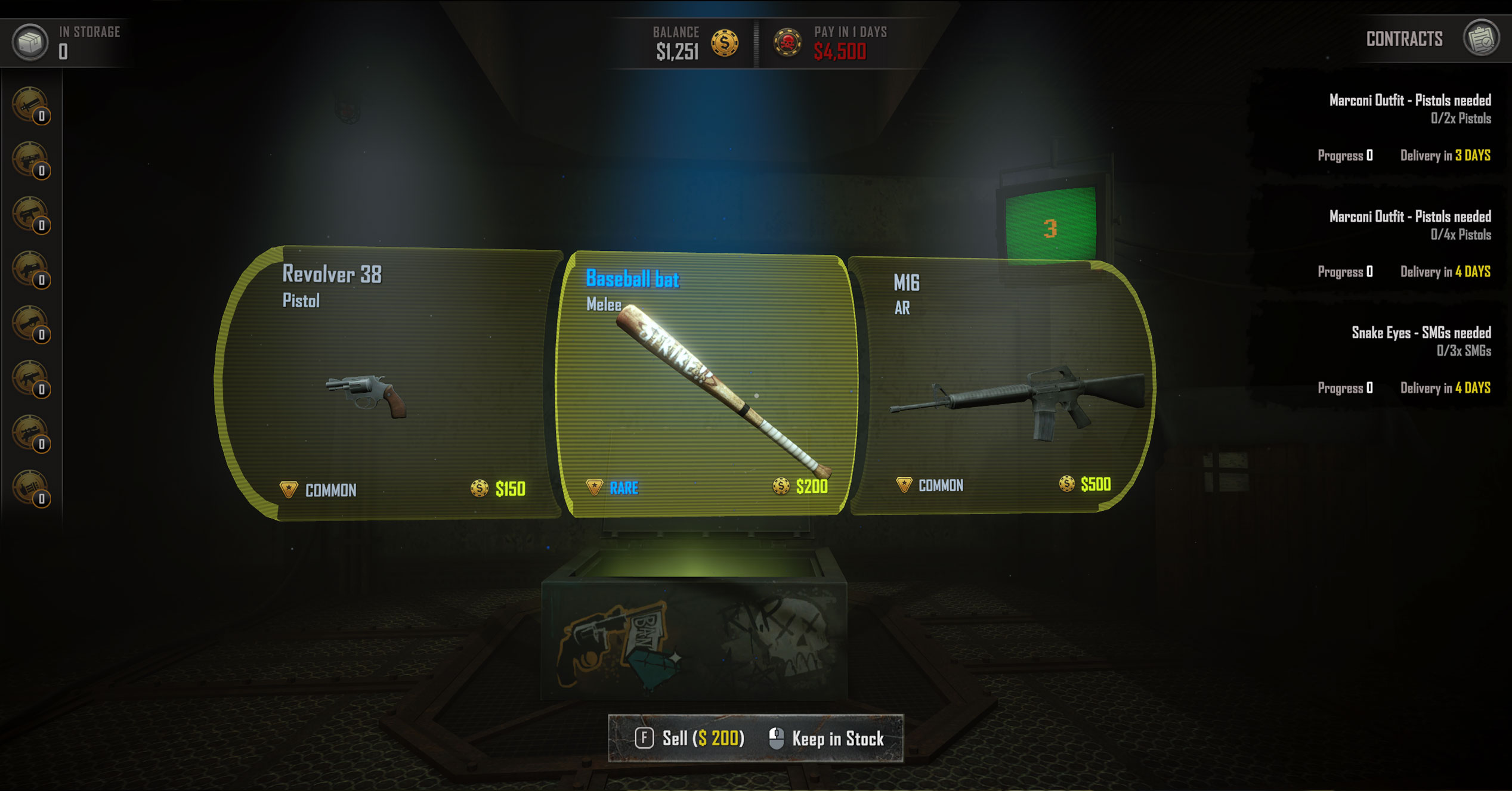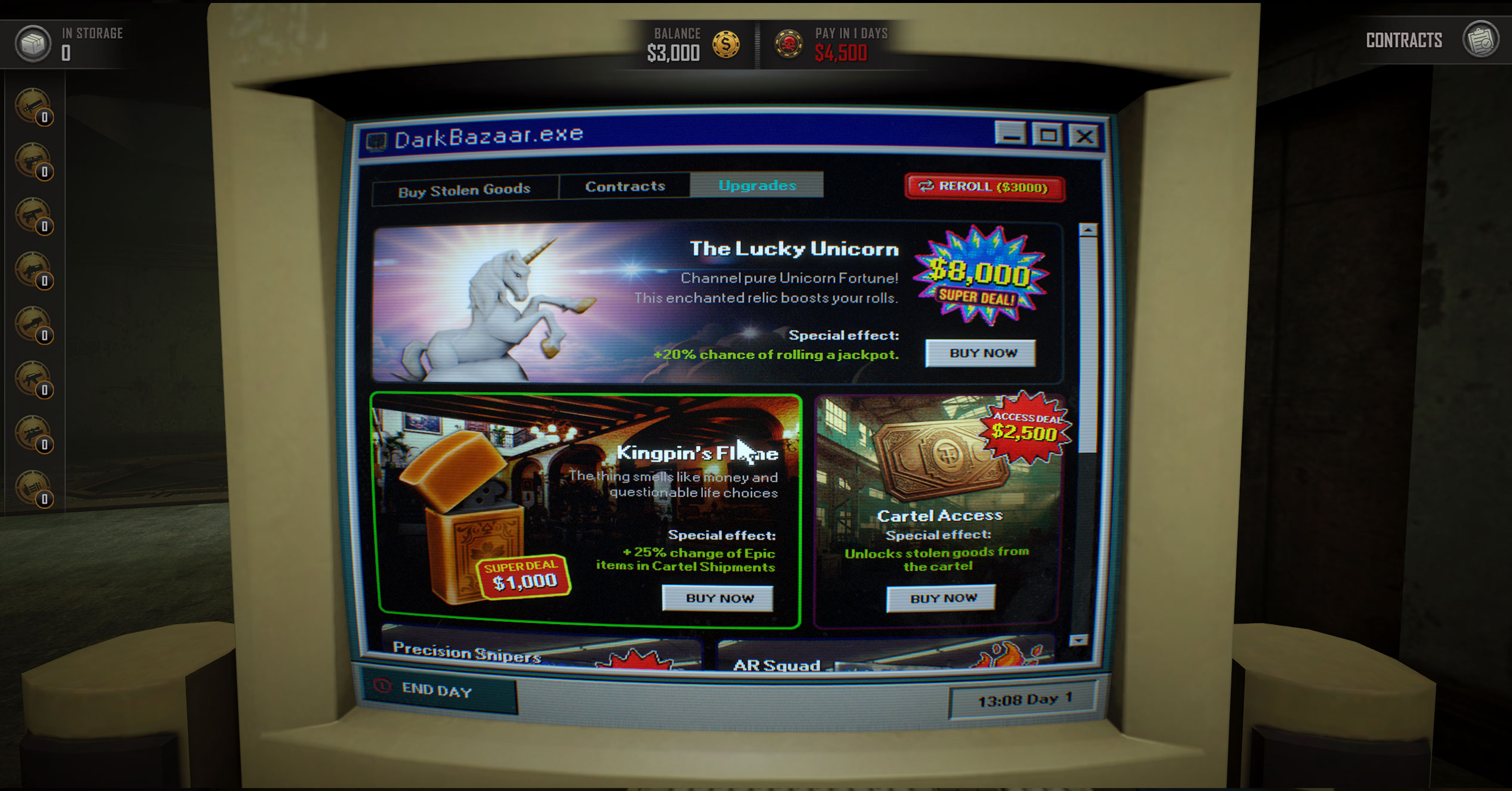 Buy weapon crates, open them and collect weapons and fulfill orders from various suspicious organisations to make money. Buy upgrades that tilt the odds in your favor, manage your money and stack synergies that help you overcome the ever increasing debt payments.